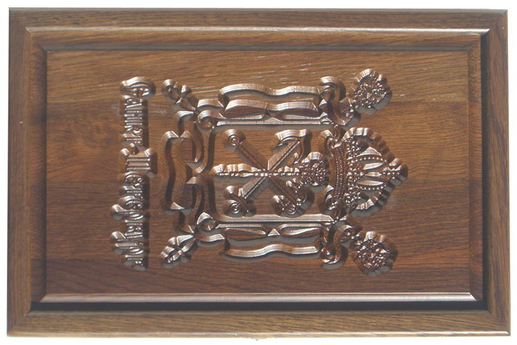 С внешней стороны на лицевой филенке вырезан герб Санкт-Петербурга в дубовом венце. На оборотной филенке вырезана доска для игры в шашки.