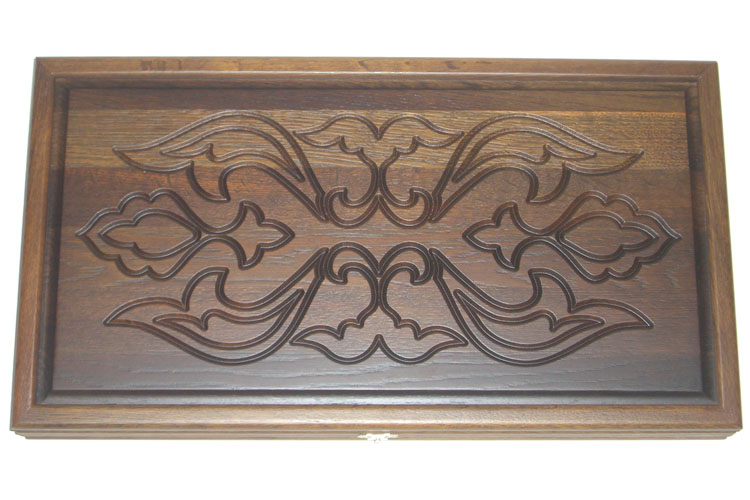 С внешней стороны на лицевой филенке вырезан древний восточный рисунок с симметричными витиеватыми узорами. На оборотной филенке вырезана доска для игры в шашки.
